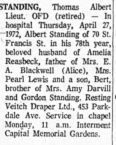 Lieut. Standing (retired) passed away April 27, 1972 at the age of 77 year.