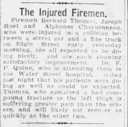 Ruel had his leg broken in a collision of a street car and ladder truck.