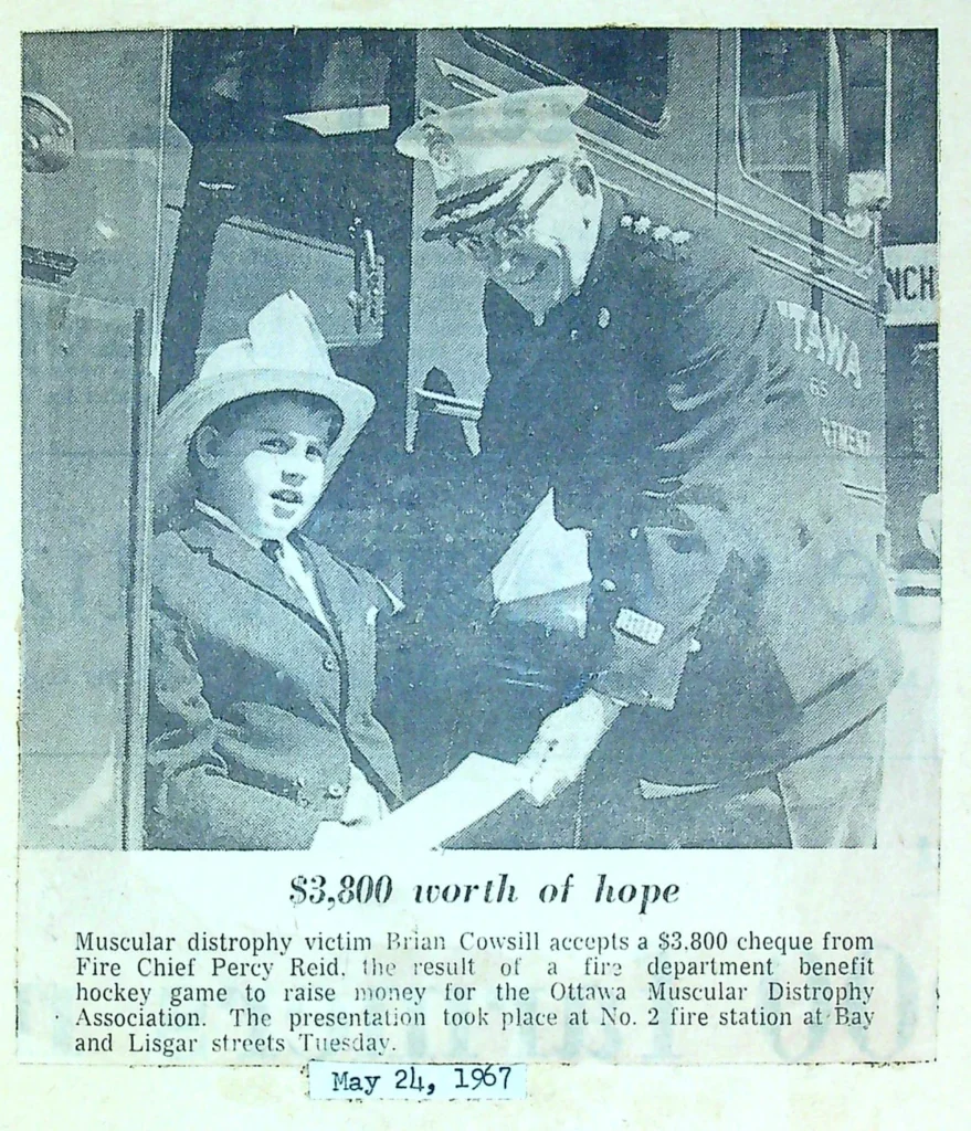 Muscular dystrophy victim Brian Cowsill accepts a $3,800 cheque from Fire Chief Percy Reid, the result of a fire department benefit hockey game to raise money for the Ottawa Muscular Dystrophy Association. The presentation took place at No.2 fire station at Bay and Lisgar streets Tuesday. May 24,1967