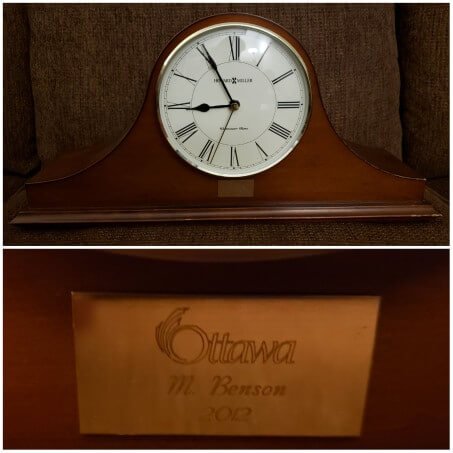 Clock presented to Maynard Benson in 2012 for his years of service Gallery_Read_More