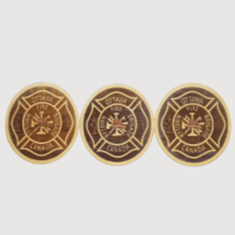A local laser wood carving artist in Ottawa has come to an arrangement with the Bytown Fire Brigade to create wooden round plaques of an etching of our Bytown crest logo.