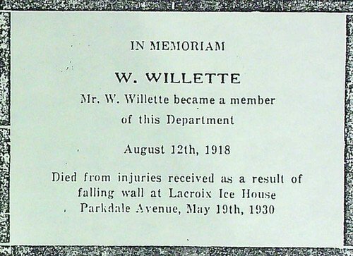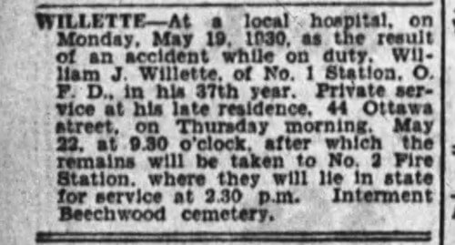 On May 19th of 1930 Firefighter Willette and Captain Robert Pratt were both killed in a fire off of Parkdale Ave in Ottawa.